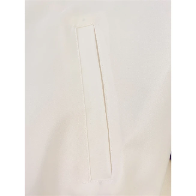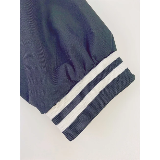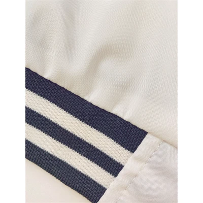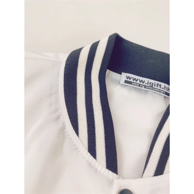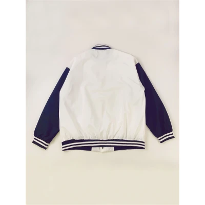 SKBJ017 棒球外套採用高品質的聚酯纖維面料製成,觸感柔軟舒適,透氣性佳,防風防雨,耐磨耐用,適合春秋季節穿着。經典的棒球服款式,白色主體搭配深藍色袖子,袖口和下擺採用經典的三道條紋設計,更顯時尚運動風。外套正面設有隱藏式口袋,方便存放隨身物品。